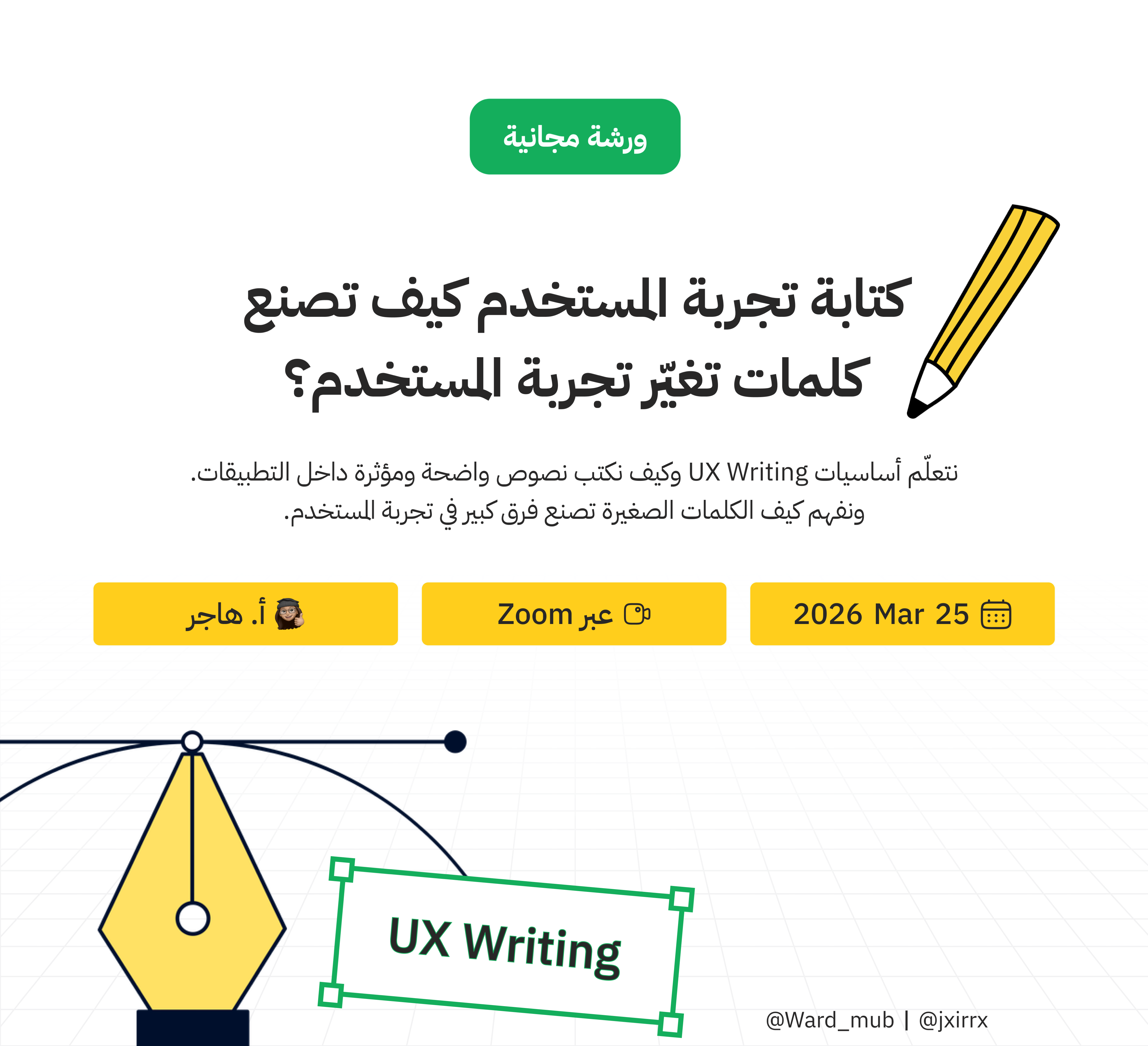 في هذه الورشة راح نتعرف على أساسيات كتابة تجربة المستخدم (UX Writing)، ونفهم كيف نكتب نصوص واضحة، مختصرة، وإنسانية ترفع من جودة المنتج الرقمي.